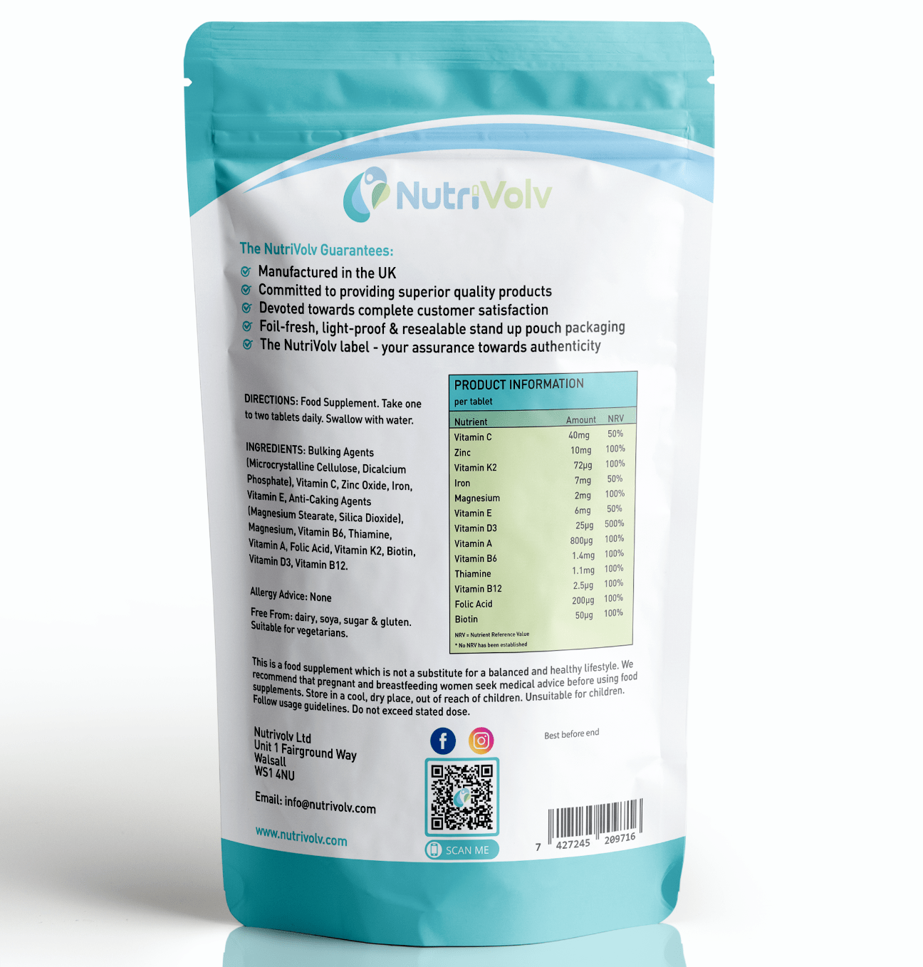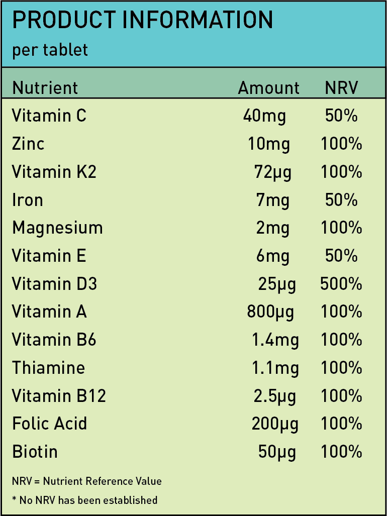 Directions to Use: Food Supplement. Take one to two tablets daily. Swallow with water. Ingredients: Bulking Agents (Microcrystalline Cellulose, Dicalcium Phosphate), Vitamin C, Zinc Oxide, Iron, Vitamin E, Anti-Caking Agents(Magnesium Stearate, Silica Dioxide), Magnesium, Vitamin B6, Thiamine, Vitamin A, Folic Acid, Vitamin K2, Biotin, Vitamin D3, Vitamin B12. Allergy Advice: None Free From: Dairy. soya. sugar & gluten. Suitable for Vegans: Yes Suitable for Vegetarians: Yes This is a food supplement that is not a substitute for a balanced and healthy lifestyle. We recommend that pregnant and breastfeeding women seek medical advice before using food supplements. Store in a cool. dry place. out of reach of children. Unsuitable for children. Follow usage guidelines. not exceed the stated dose.