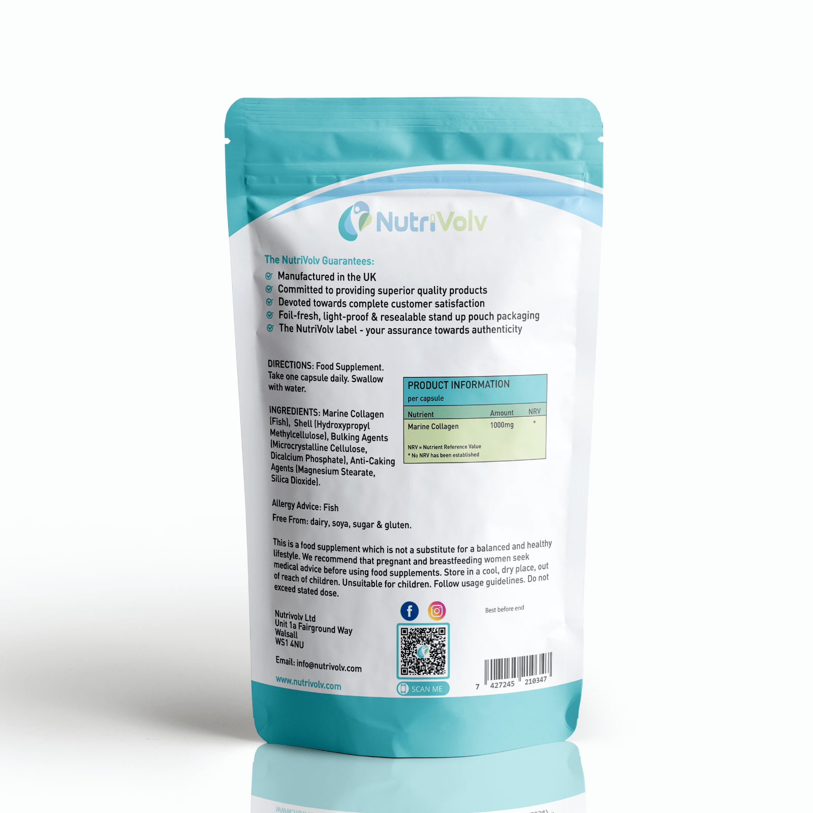 Collagen (Marine) 1000mg (30 Capsules) is formed of collagen peptides that are derived from fish. This has the most superior absorption of all collagen types which allows it to pass through the intestinal wall into the bloodstream more easily to provide better healing. repair and nourishment.