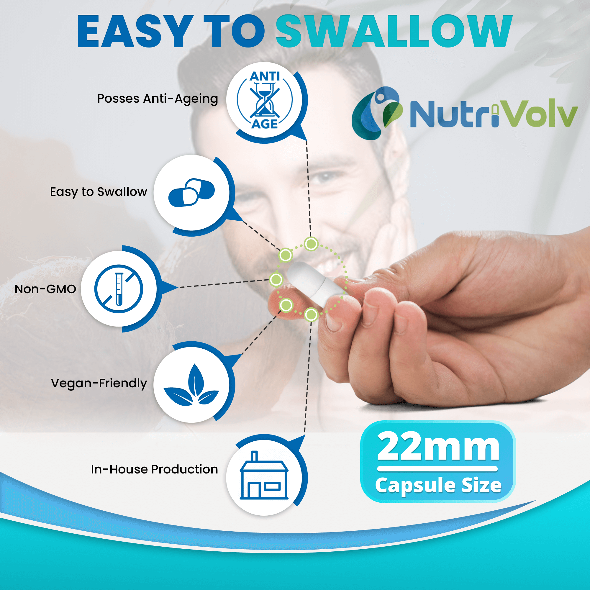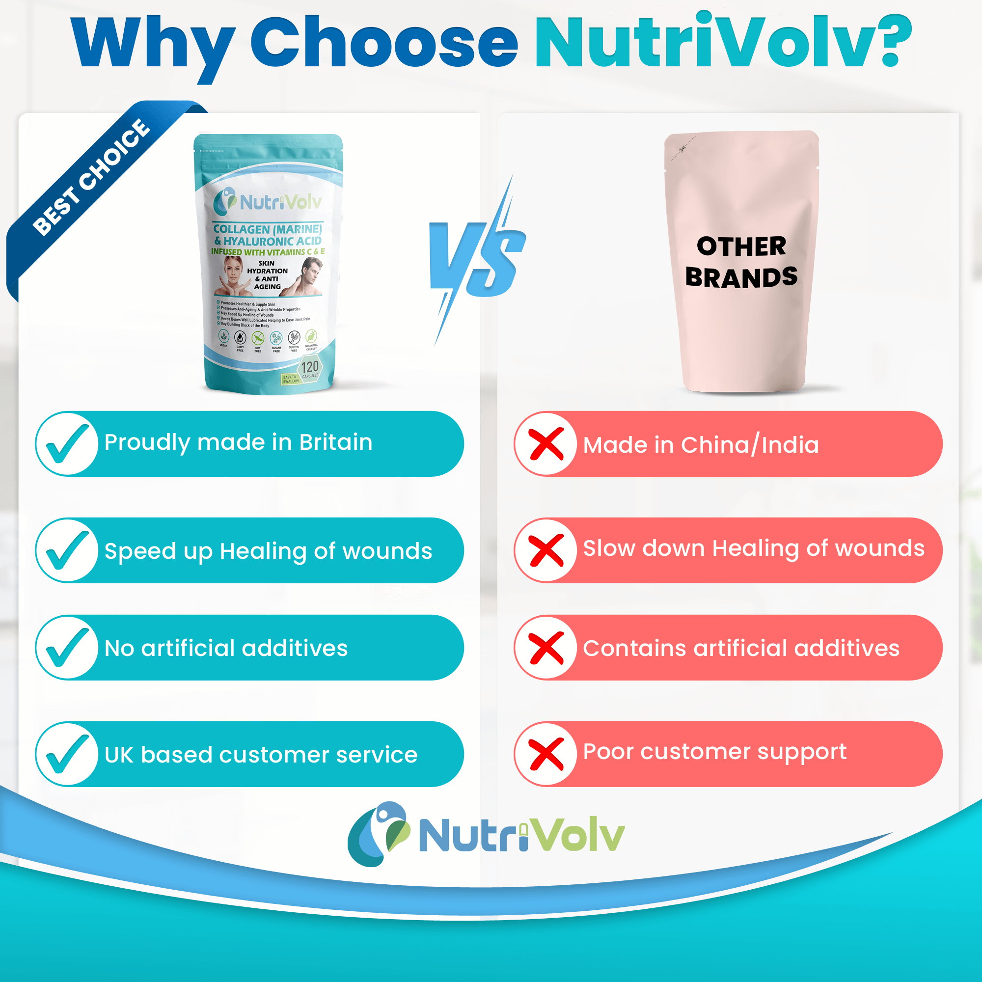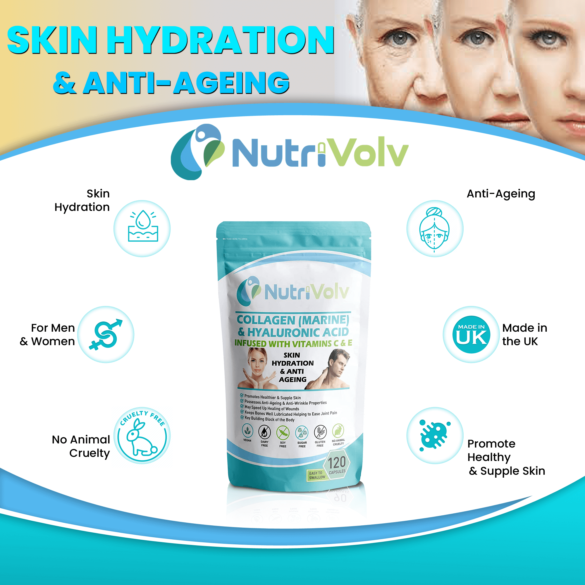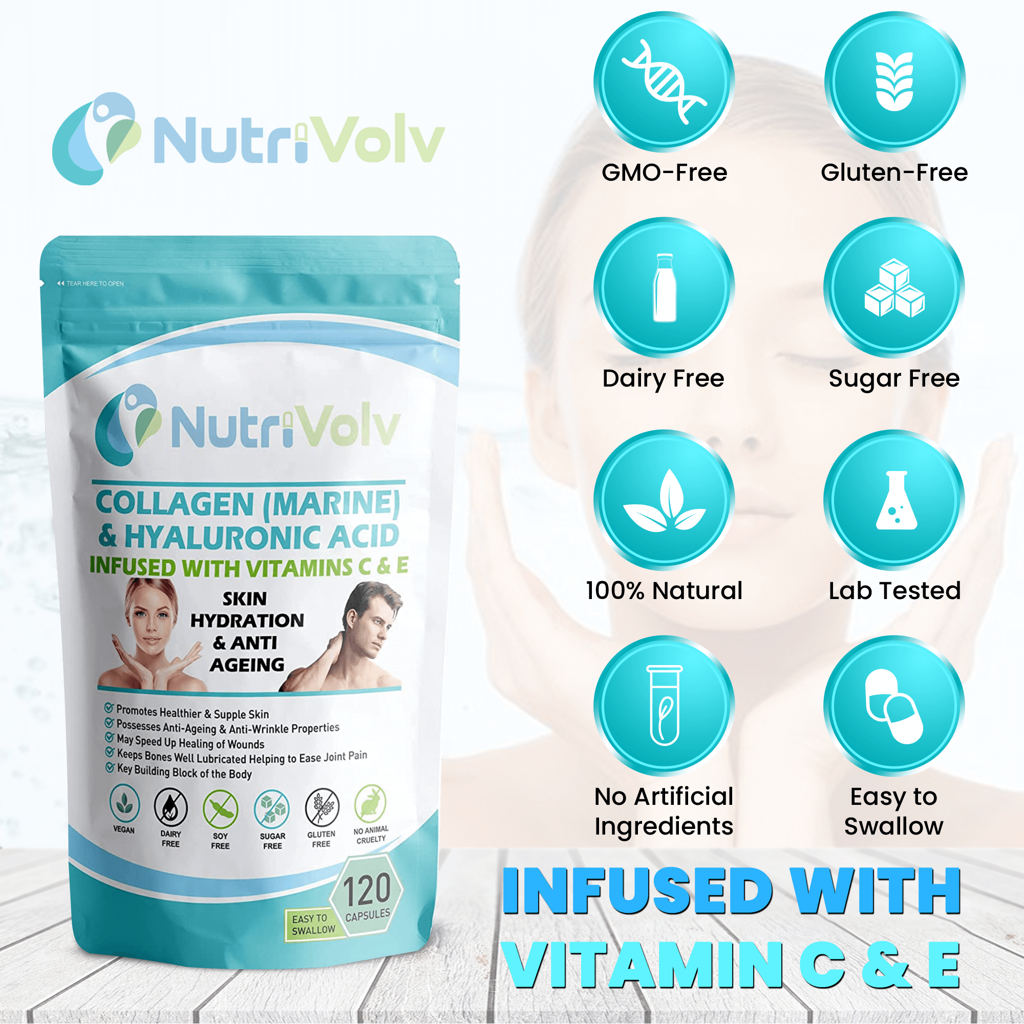 Reduction in collagen protein leads to weaker bones. fragile nails. brittle hair and dry skin. NutriVolv Collagen capsules help restore your youthful skin health. hair. nails. bones. tendons and joints.