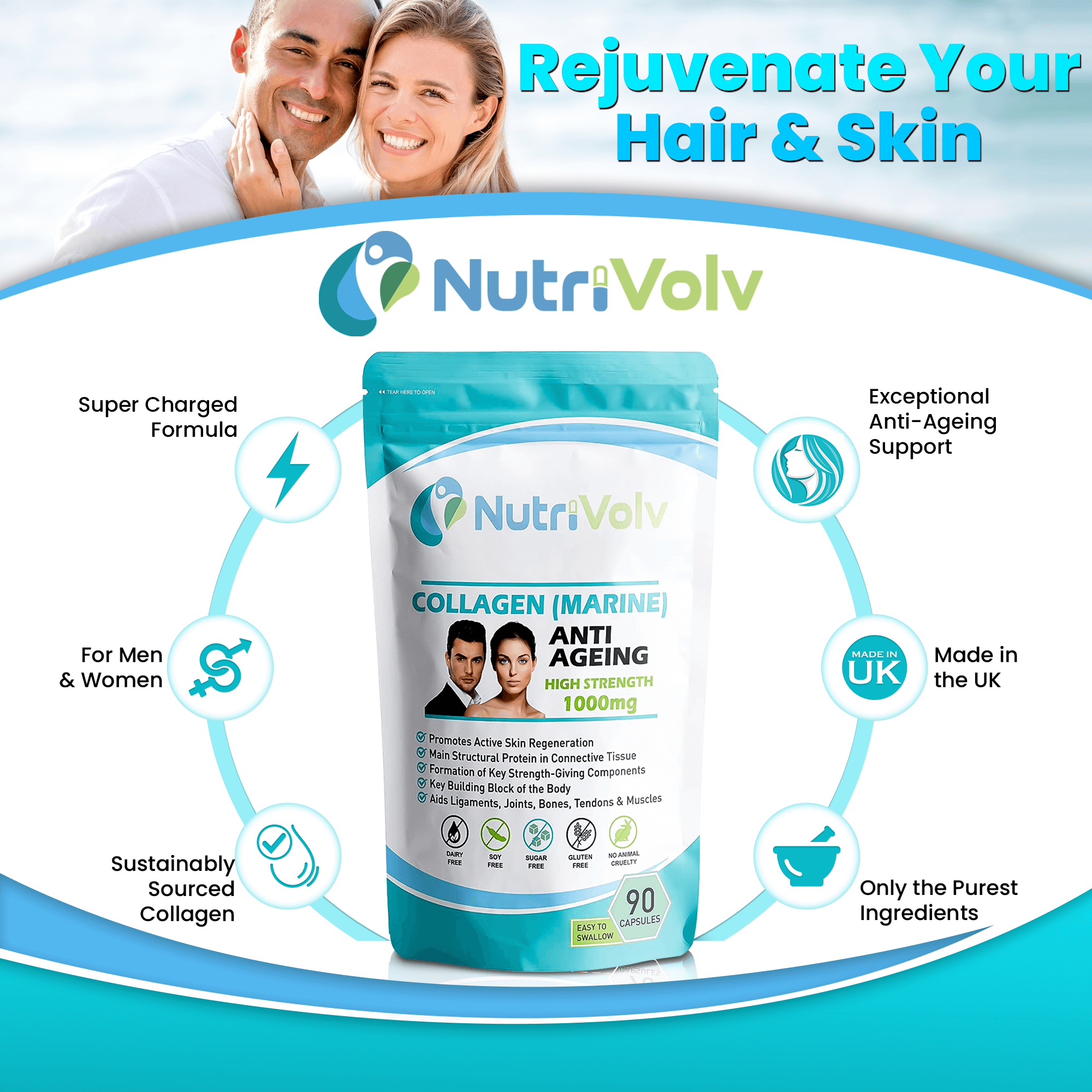 Reduction in collagen protein leads to weaker bones. fragile nails. brittle hair and dry skin. NutriVolv Collagen capsules help restore your youthful skin health. hair. nails. bones. tendons and joints.