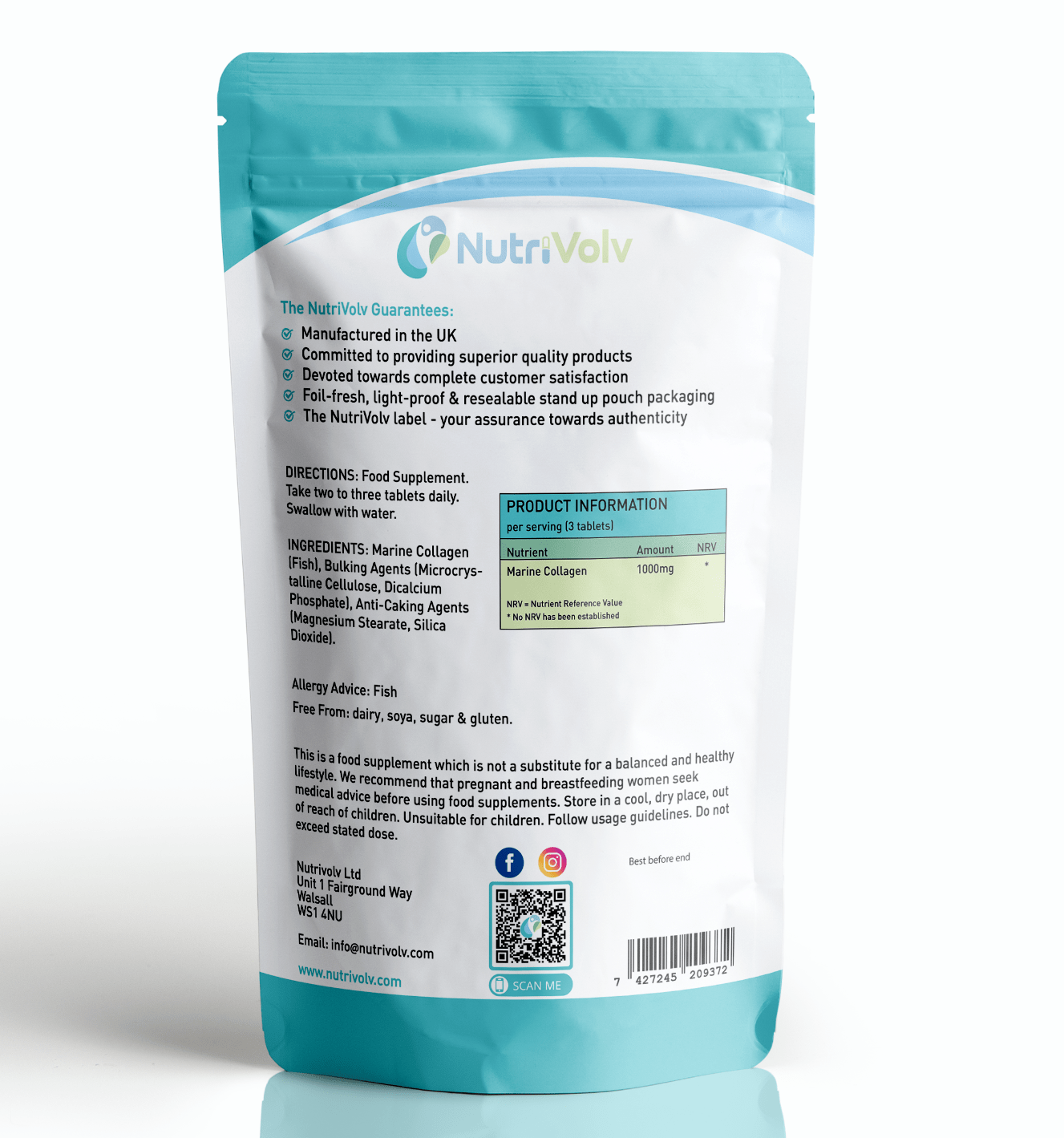 Reduction in collagen protein leads to weaker bones. fragile nails. brittle hair and dry skin. NutriVolv Collagen tablets help restore your youthful skin health. hair. nails. bones. tendons and joints.