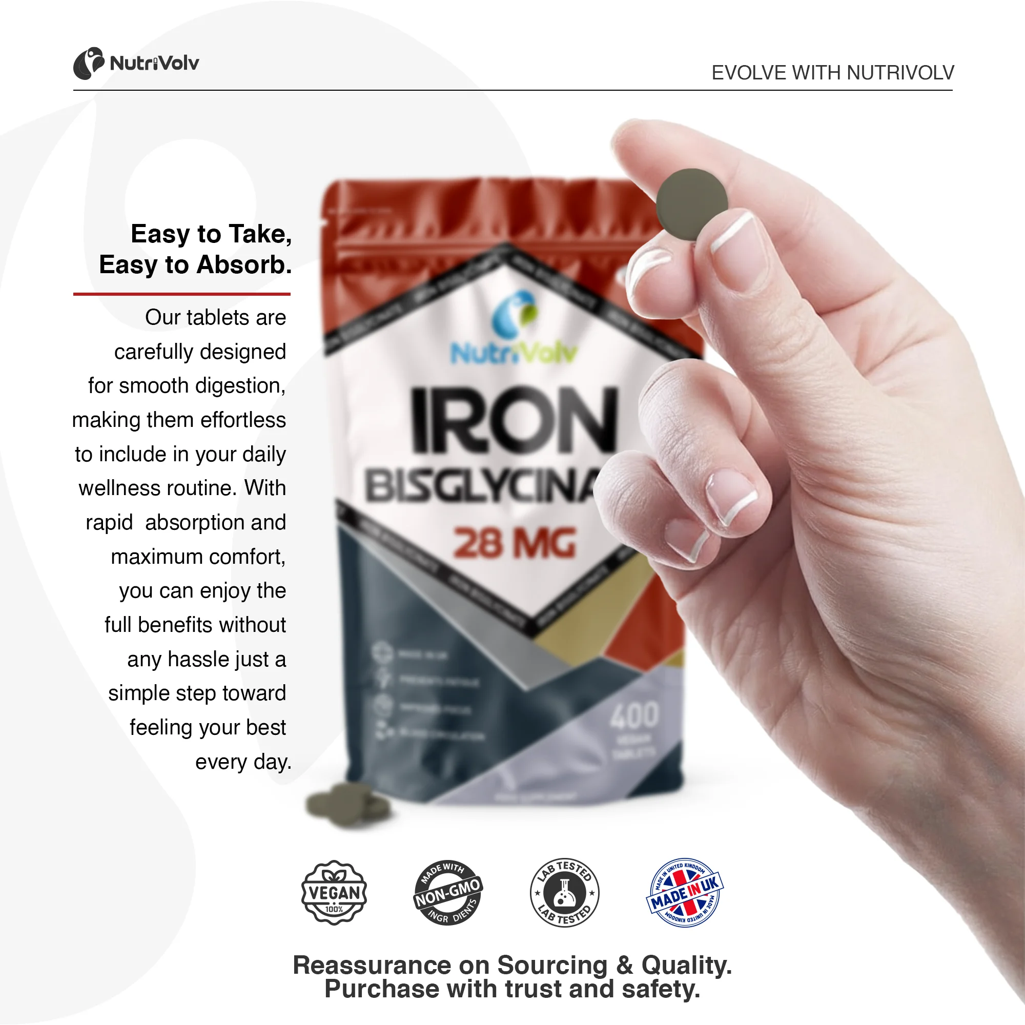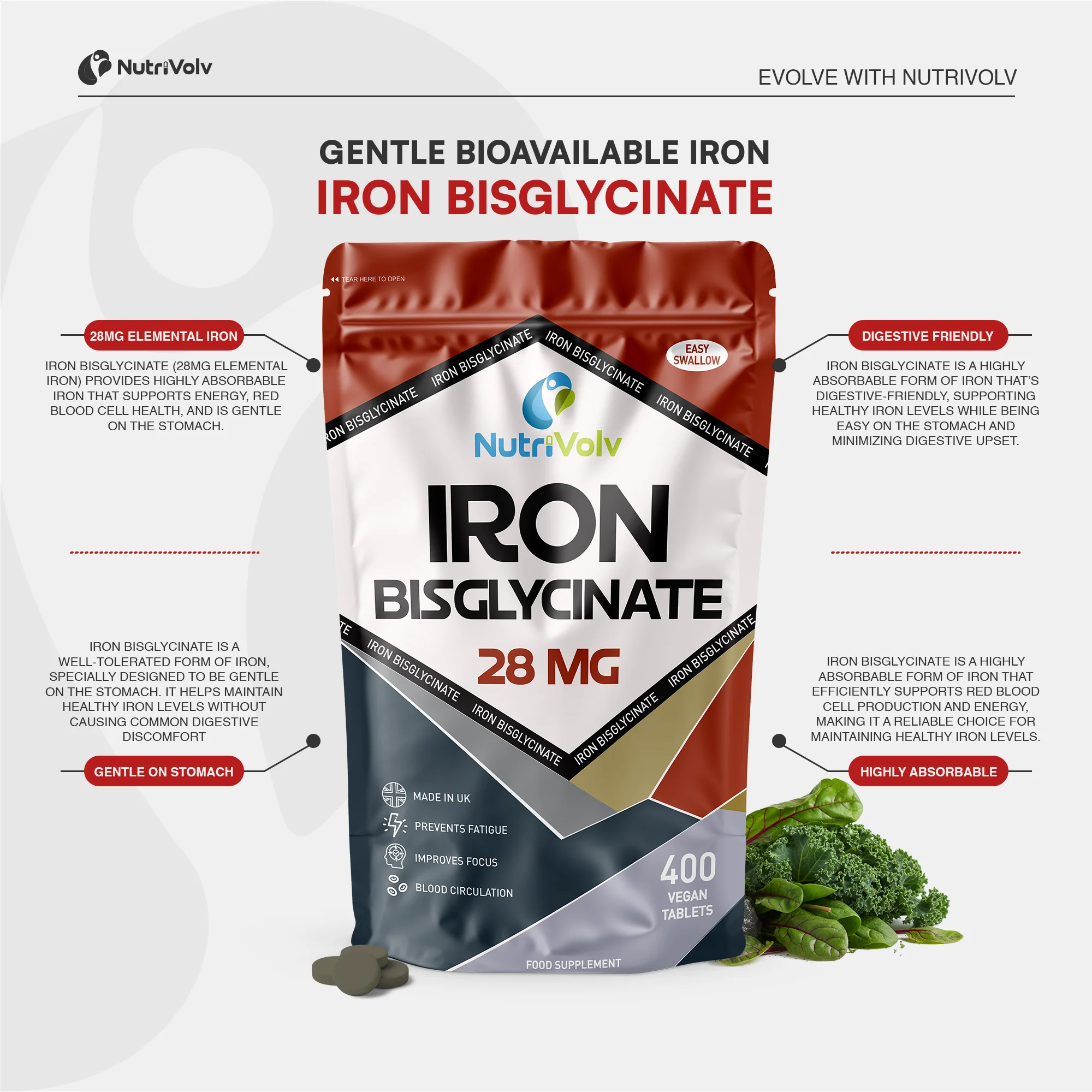 Iron Bisglycinate 28mg provides a gentle, highly absorbable form of iron designed to support normal red blood cell formation, oxygen transport and energy levels. This form is known for being well tolerated, making it suitable for long-term use. Ideal for adults with increased iron needs or low dietary intake. The 400-tablet supply offers excellent value and convenience. Best taken with food and used consistently alongside balanced nutrition for effective iron maintenance.